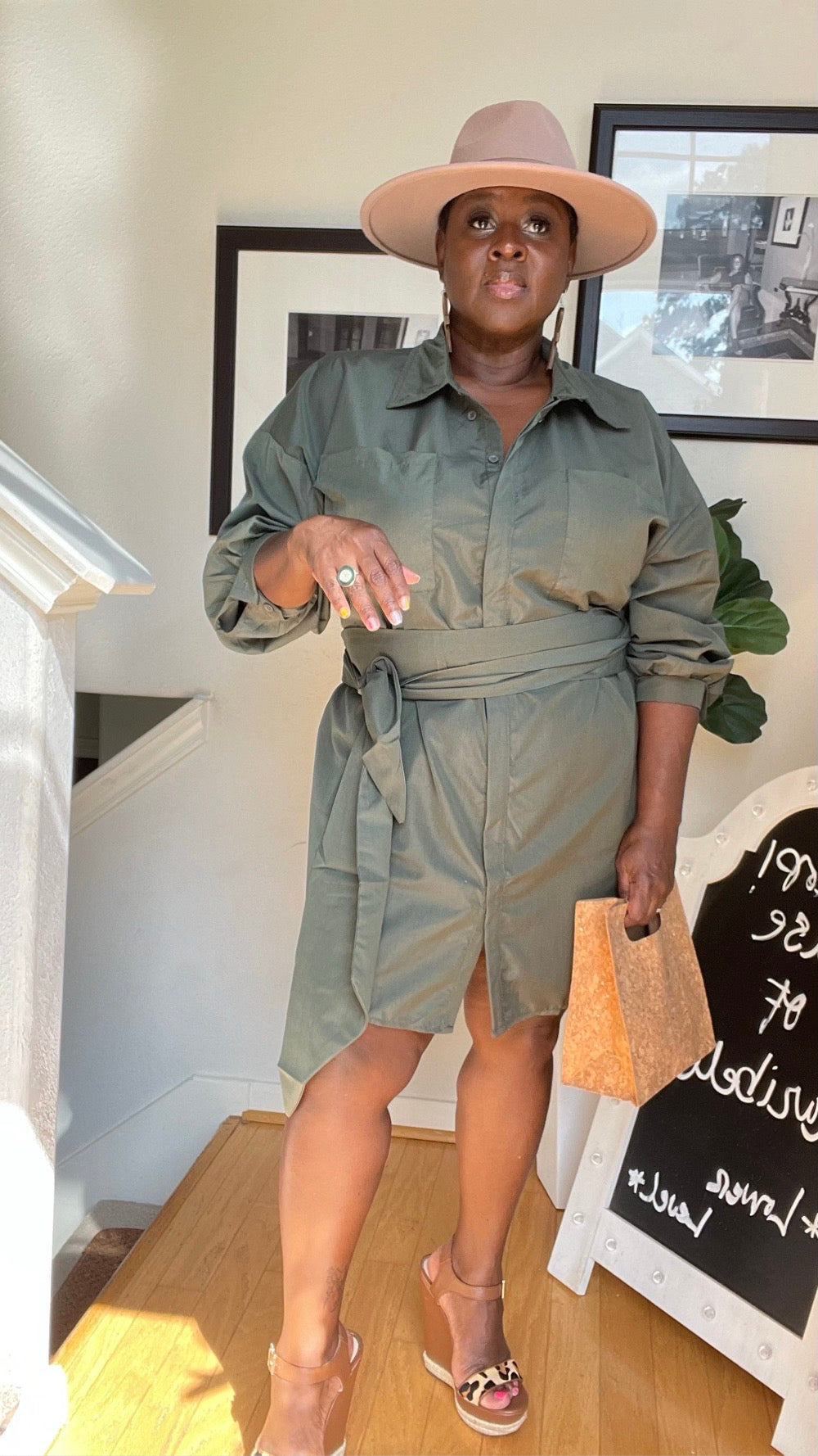 Classics button down shirt dress with matching belt. This dress is designed along the style of Bae’s favorite dress shirt with two button cuffs and button down collar. Even the hem is cut like the classic button down shirt which is what gives this dress its sexiness! Unbelted the dress will fall right above the knee and belted will help reveal a little more leg.